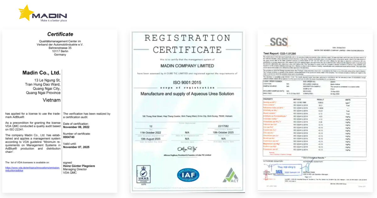 Madin offers its AdBlue solution in a ratio of 32.5% urea and 67.5% deionized water, and emphasizes compliance with relevant standards such as ISO 22241/DIN.